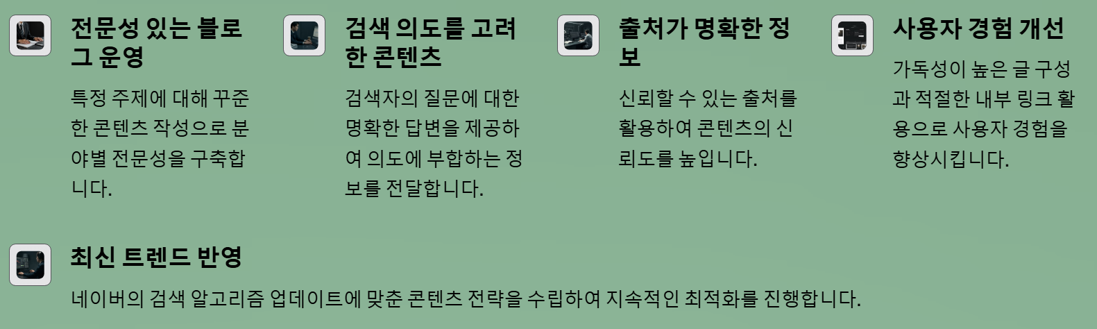• 전문성 있는 콘텐츠 제공 → 특정 주제에 대해 꾸준한 글 작성