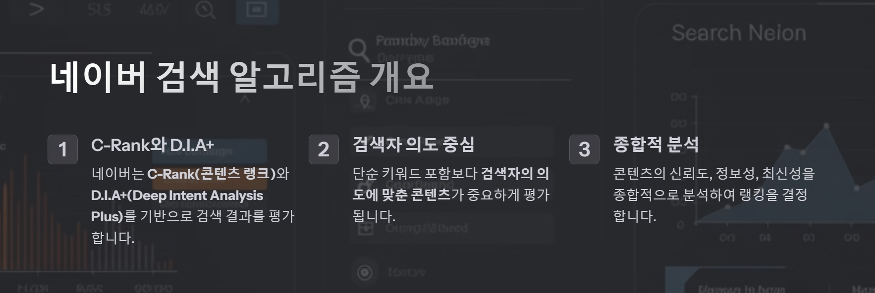 D.I.A+는 사용자의 검색 의도를 분석하여 가장 적합한 콘텐츠를 노출하는 알고리즘입니다. 단순 키워드 매칭이 아닌 문맥과 검색 의도를 분석하여 검색 결과를 구성합니다.