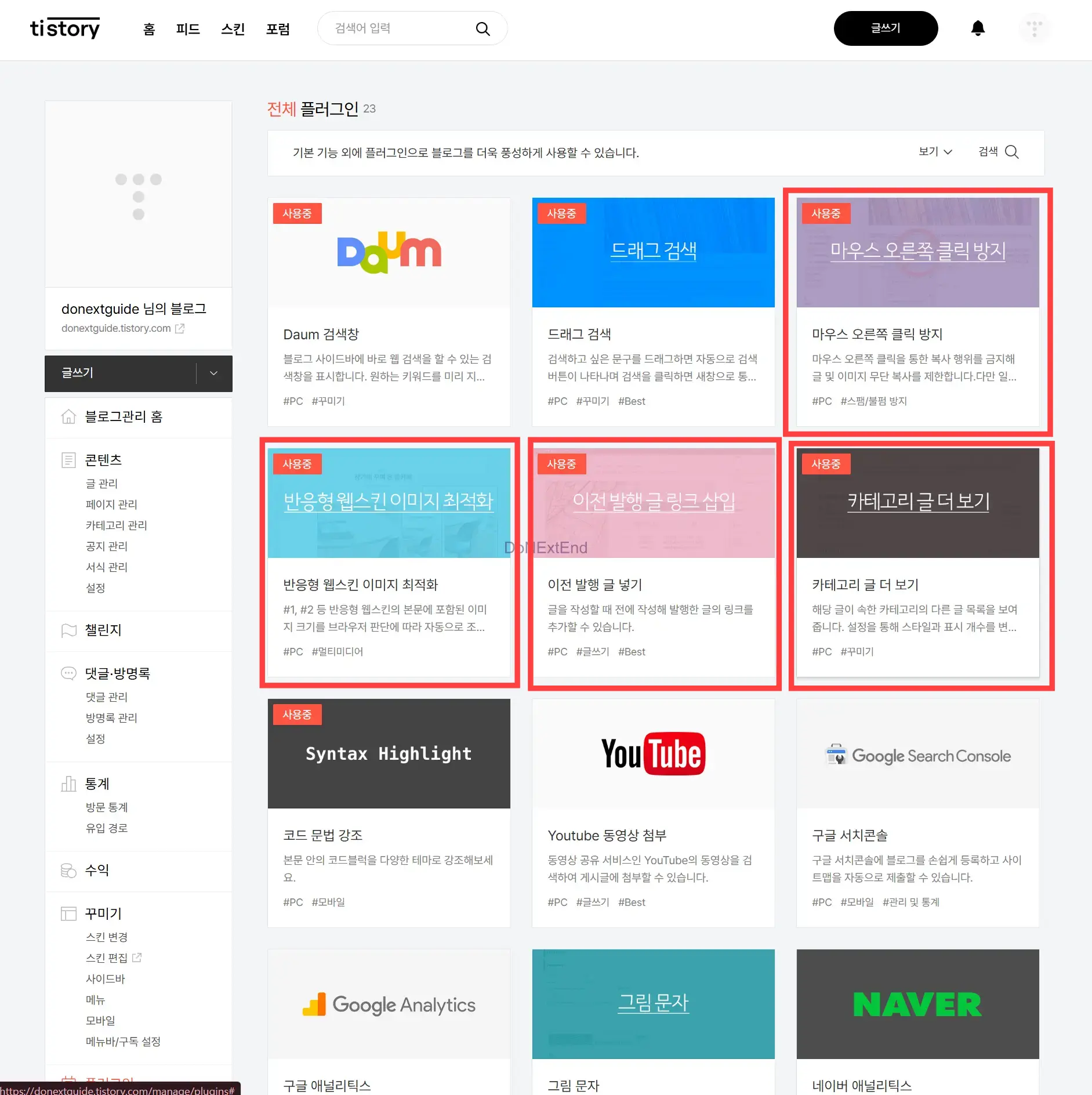 - "꾸미기 > 플러그인"에서 필요한 6가지 활성화 추천: