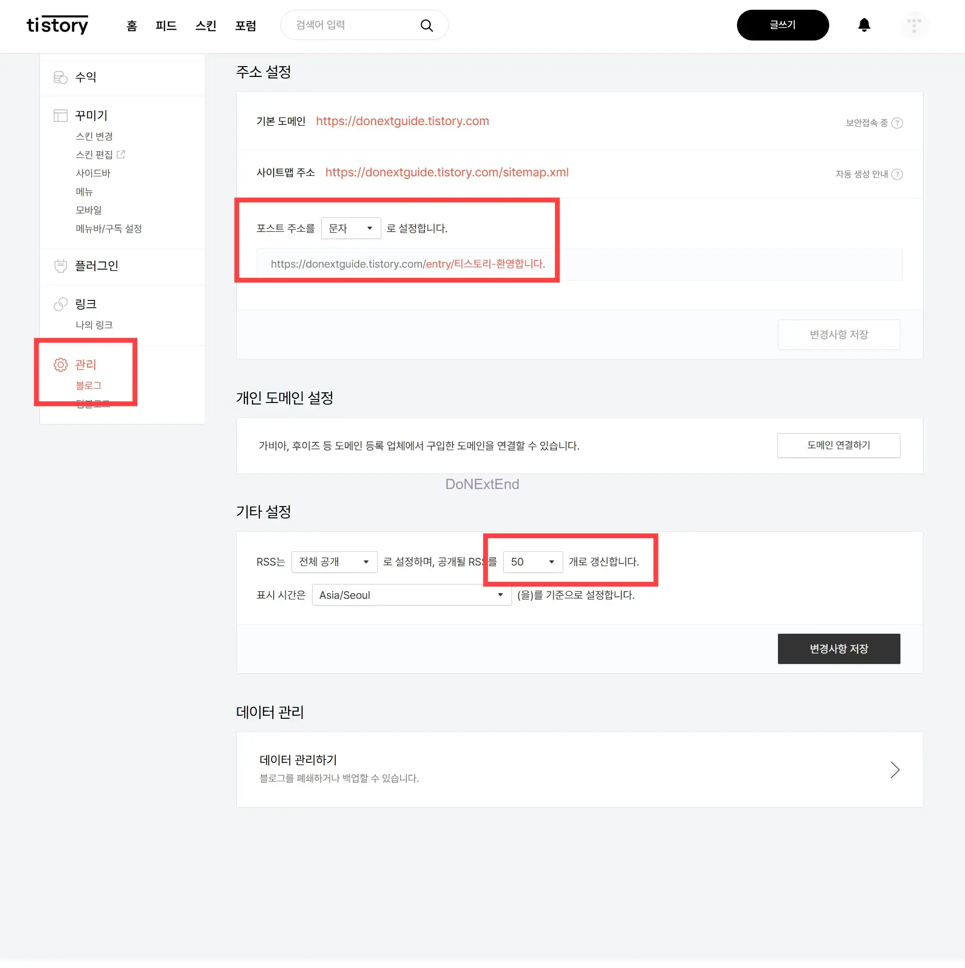 이번 글에서는 티스토리 위주의 설정을 먼저 설명하고, 각 항목별 세부설정도 따로 올려드리도록 하겠습니다.
