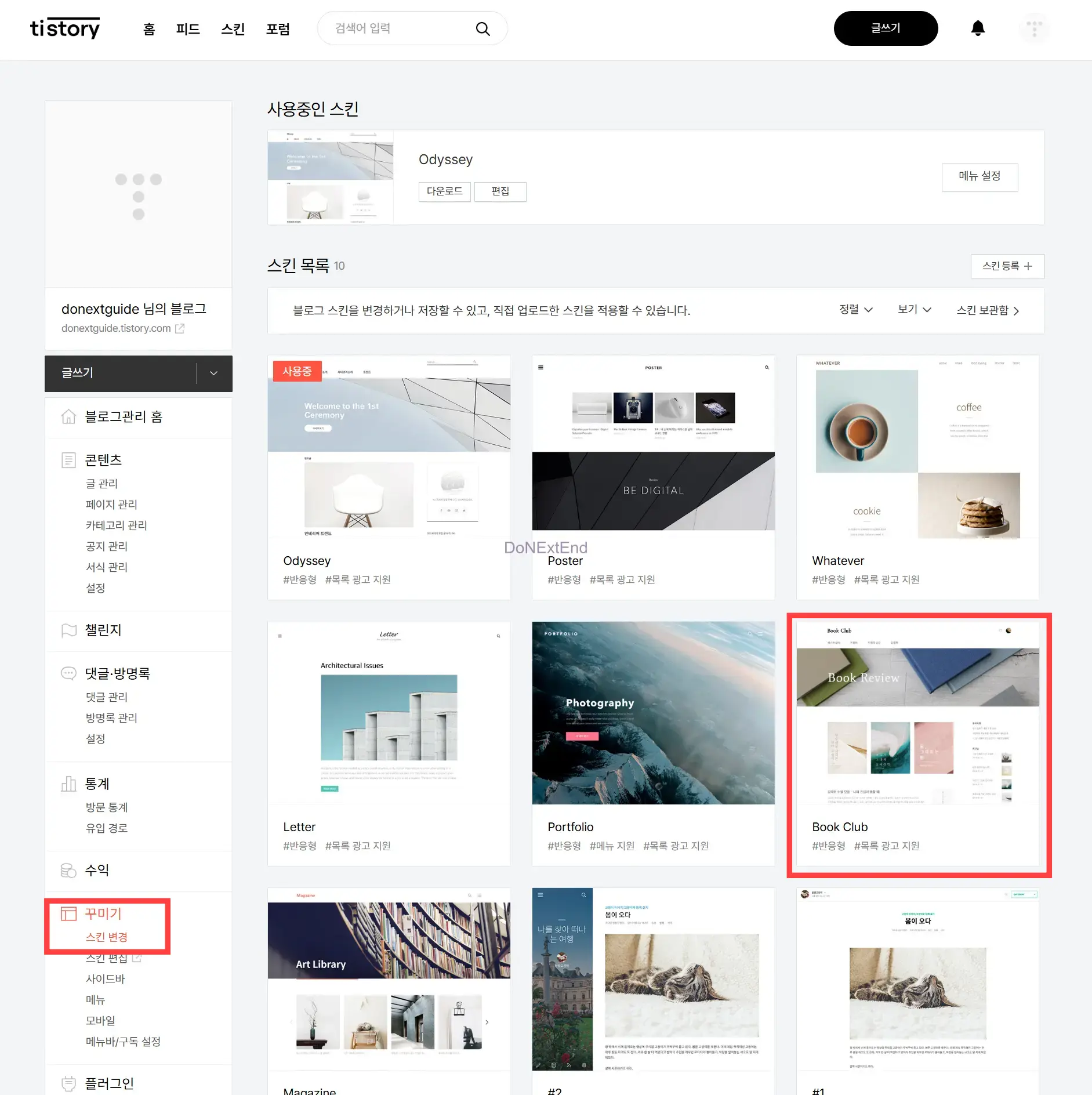 - "꾸미기 > 스킨 변경" 메뉴로 이동하여 많은 분들이 선호하는 "북클럽" 스킨을 선택하세요.