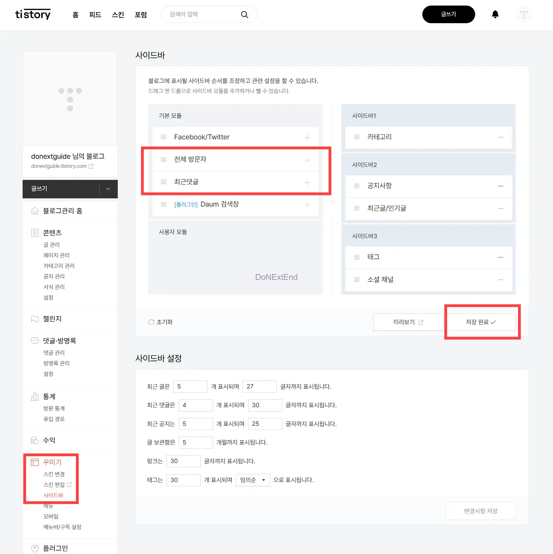 - "꾸미기 > 사이드바"에서 최근 글, 댓글, 방문자 수 등은 불필요한 정보일 수 있으니 모두 삭제하고 "변경사항 저장"을 해주세요.