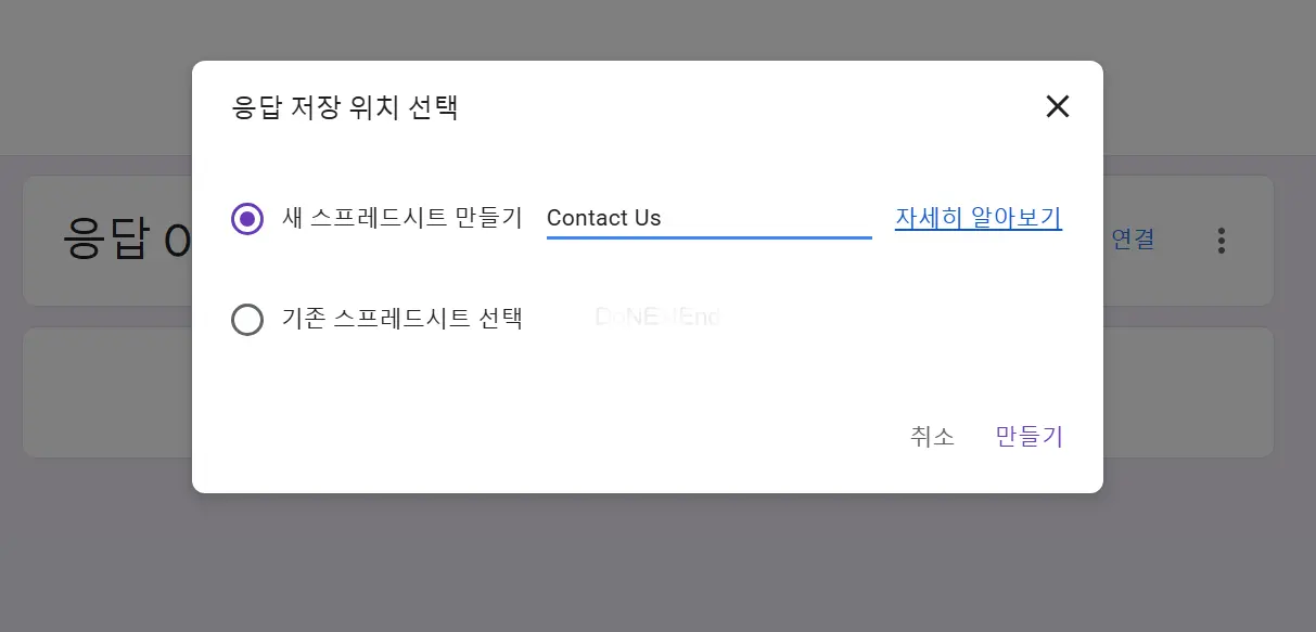 - 폼 상단에서 "응답" 탭을 클릭한 후, 구글 스프레드시트와 연동