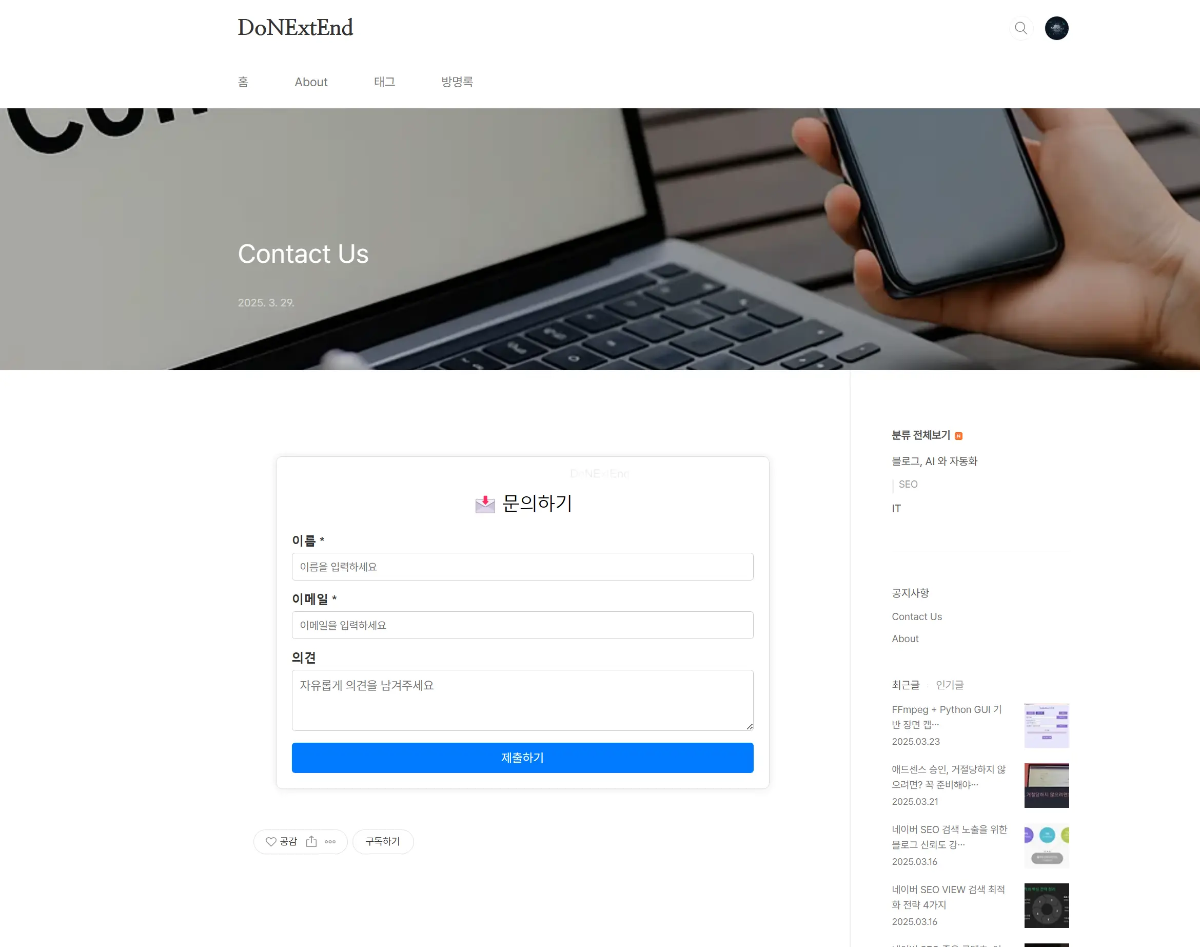 이 과정에서 여러 시행착오를 겪었지만, 최종적으로 SEO 친화적인 문의 페이지를 블로그에 성공적으로 추가할 수 있었다.