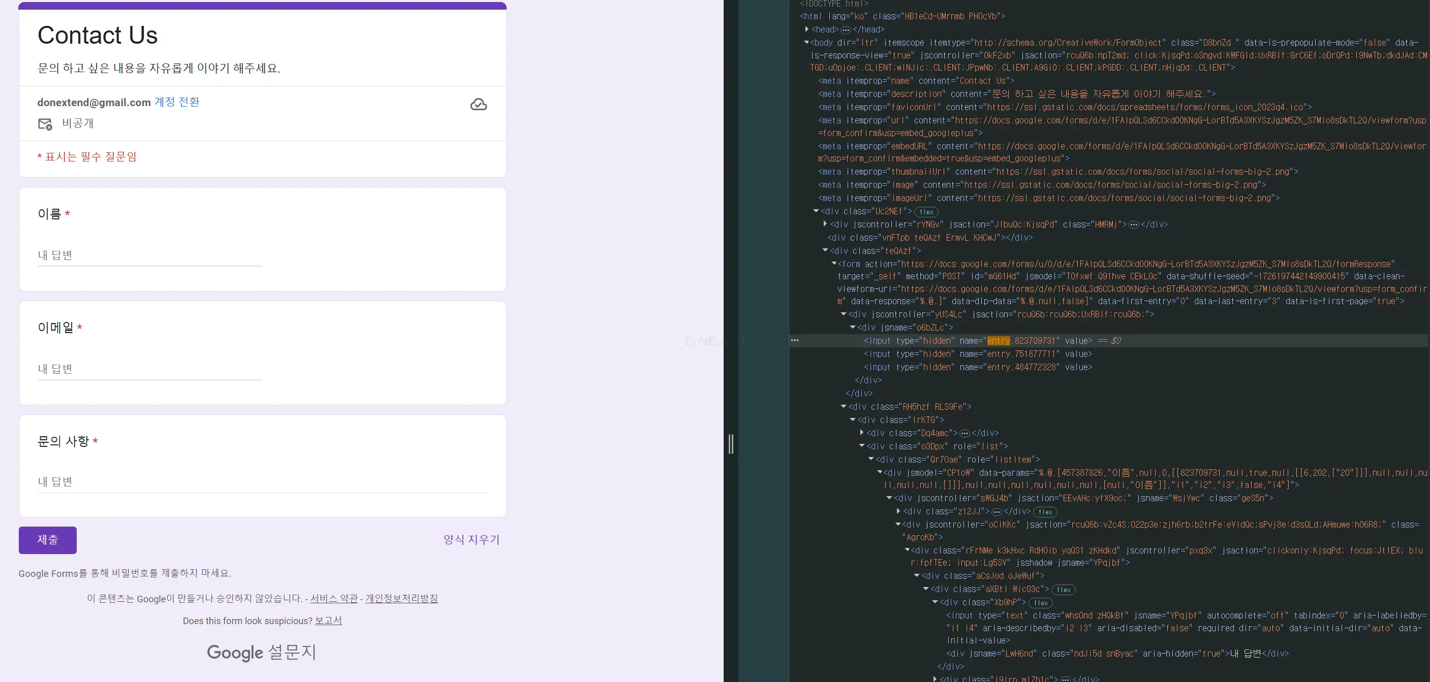 예를 들어, entry.823709731 같은 값이 보이면, 해당 숫자가 입력 필드의 고유 ID이다. - 각 필드의 Entry ID를 복사하여 HTML 폼에 적용